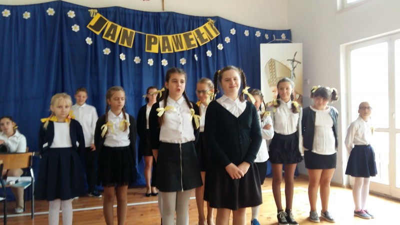 Tegoroczny Dzień Papieski przebiegał pod hasłem; "Bądźcie Świadkami Miłosierdzia". Dzieci zapoznały zebranych z życiorysem Wielkiego Polaka, recytowały wiersze oraz przypominały ciekawostki z życia papieża. Z wielkim uznaniem goście wspominali wykonanie piosenki Marka Grechuty pt. „Ojczyzna” . Uczniowie zaprezentowali swoje umiejętności muzyczne, wokalne i recytatorskie.